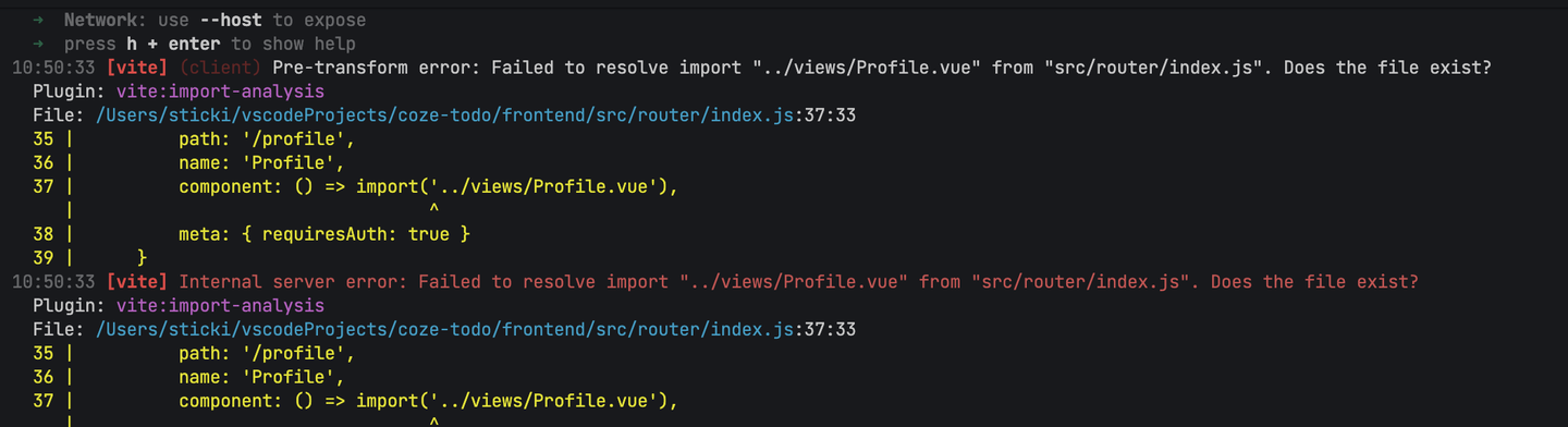 不过这个问题相对简单,我作为后端开发者也看得出来是哪里出错了,它引入了一个不存在的页面,我直接注释掉那段代码,重新运行就不报错了。