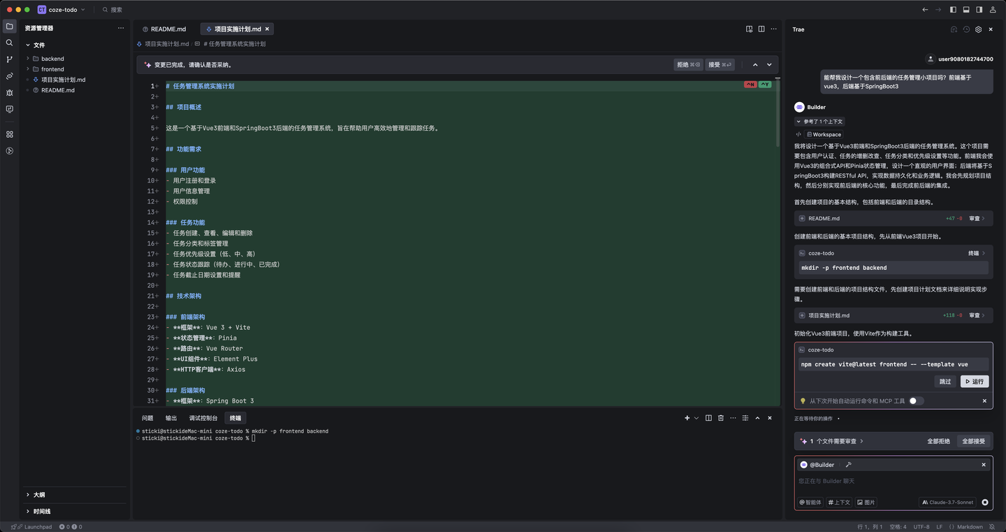 首先,我让 Trae 帮我大致设计一下整个项目的框架。