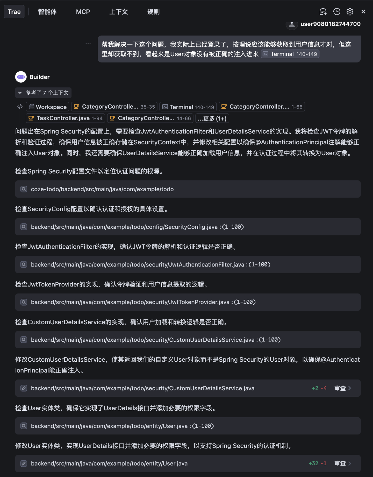 - 在查看他人代码时,若发现潜在的错误,可以直接请求 Trae 帮忙确认,并自动生成一个 issue。