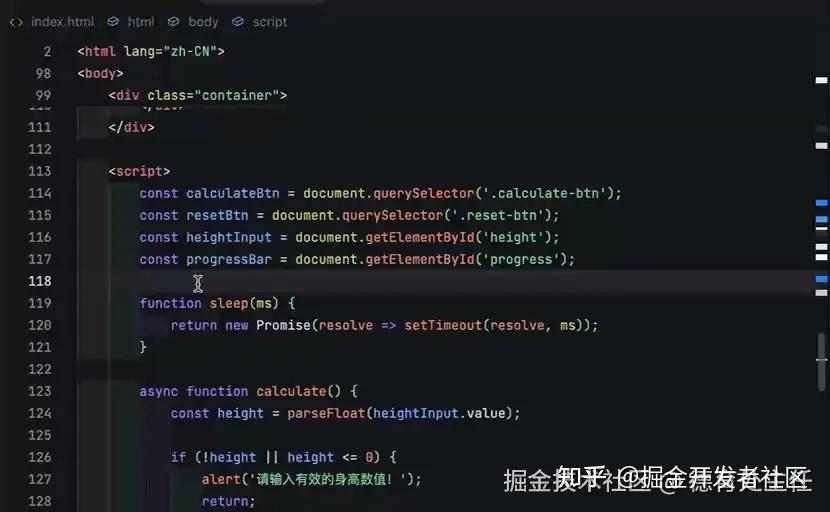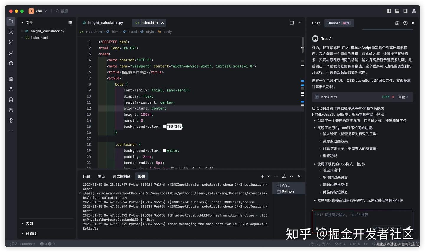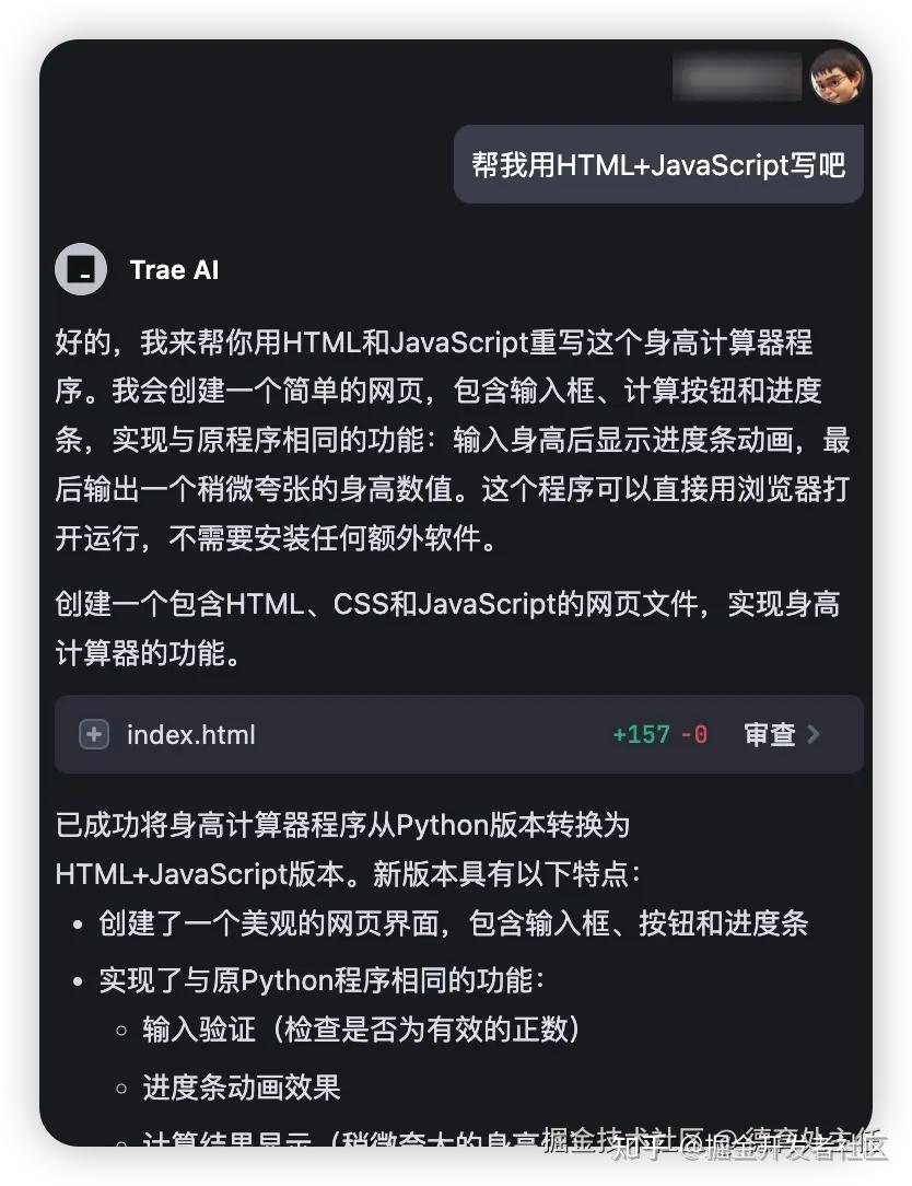 当我输入需求后,等待了十几秒。Trae 在我们的项目文件夹中创建了一个名为 index.html 的文件,里面填充了各种代码。