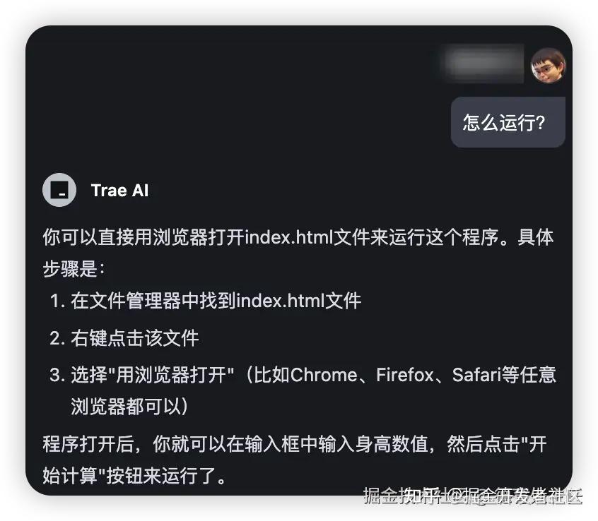 Trae 提供了一个步骤,虽然稍显复杂,但确实可行。实际上,你可以在文件管理器中找到 index.html 文件,双击它即可直接运行。