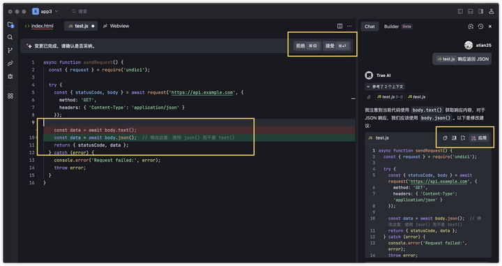小小提示:如果在使用 Trae 时发现需要手动“应用”,请务必检查 Chat 对话框中是否缺少 @builder。下次我们将进行优化!