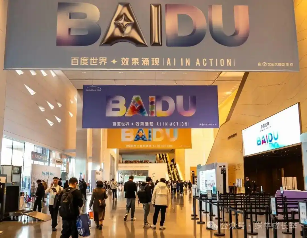 第一张照片捕捉到了大会入口的热闹场景——一条巨型横幅“百度世界 效果涌现 | AI IN ACTION”高悬于上方,文心大模型生成的标识则暗示着 AI 技术在大会中的深度应用。观众们或驻足仰视,或相互交流,空气中弥漫着大家对 AI 成果的期待,正式开启了这场“AI 从理论走向实践”的盛宴。