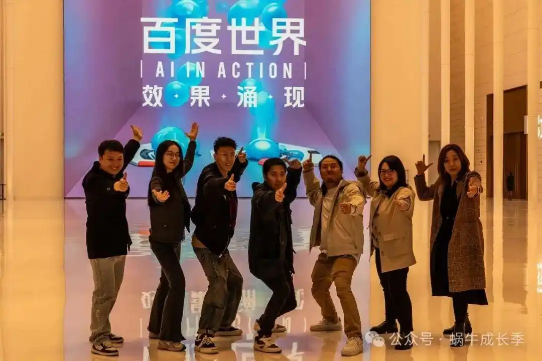 最后一张照片围绕“人”展开,生动地诠释了“效果涌现”的意义——在巨大电子屏前,写着“百度世界 AI IN ACTION 效果涌现”,七位参与者站成一排,或竖起大拇指、或比出“耶”的手势、或指向前方,轻松的装扮与灿烂的笑容传达出浓厚的参与感。背景屏的蓝紫色渐变与蓝色球体延续了大会的科技氛围,而参与者活力四射的姿态则将“AI 落地”的主题从技术领域带回到人们的真实体验中。