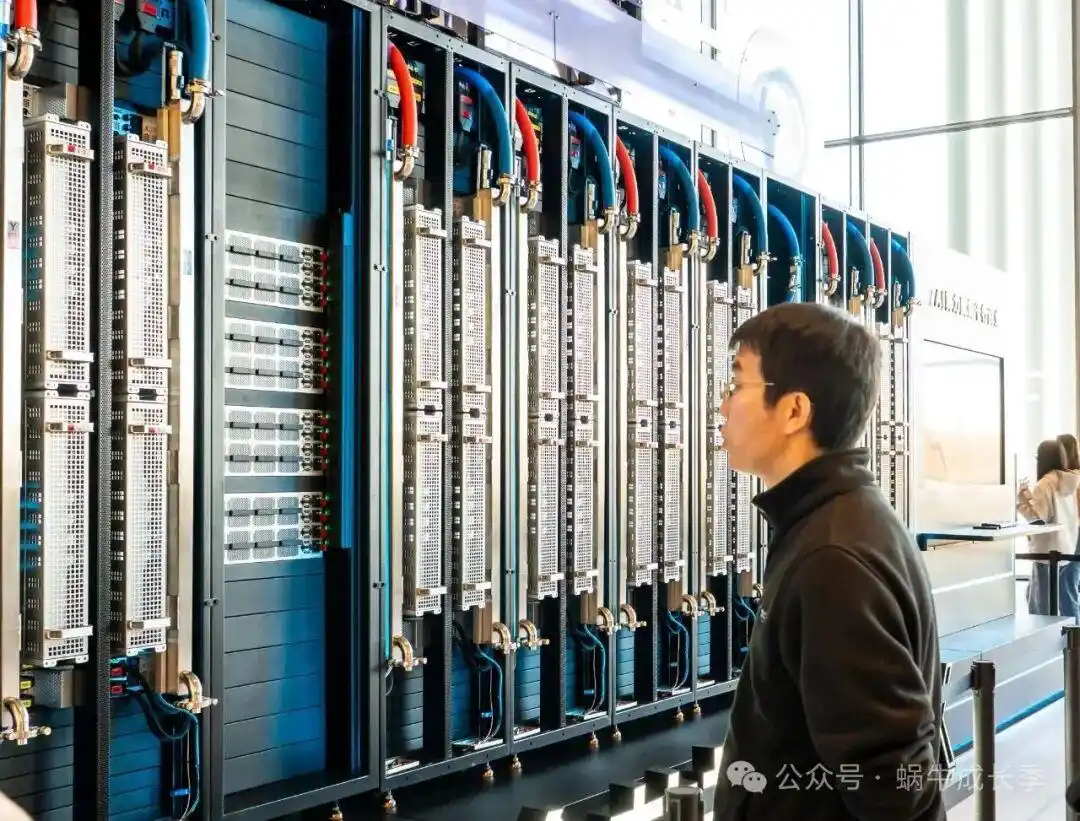 昆仑芯算力基础设施展现:服务器机柜整齐排列,蓝色指示灯闪烁,观众们聚精会神——作为百度的芯片公司,昆仑芯为 AI 应用提供基础算力支持,是实现“AI 落地”的核心基石;