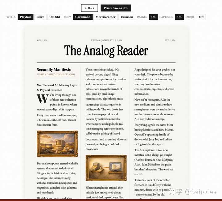 小编点评:Analog Reader 在数字洪流中犹如一曲逆流而上的旋律。当众人追求实时、沉浸与算法驱动的信息时,它却选择了“延迟”、“离线”和“实体化”。这一产品体现了对抗“数字负担”和“注意力涣散”的强烈愿望。它并不提供新颖的内容,而是创造了一种新的“内容享受仪式”。通过将数字信息转化为可打印、可触摸、无干扰的实物,Analog Reader 构建了一个让人专注的阅读时空。这种转变实际上是“媒介的简化”,却是为了提升“体验”。它启示我们,科技的真正价值有时不在于让我们更迅速,而在于帮助我们更好地“停下脚步”。尽管 Analog Reader 外观简约,却触及了人机交互中的深刻矛盾:我们创造了无尽的信息流,但大脑和心灵却渴望有限、深邃且有边界的体验。它是一个为自己设立“数字防护墙”的工具。