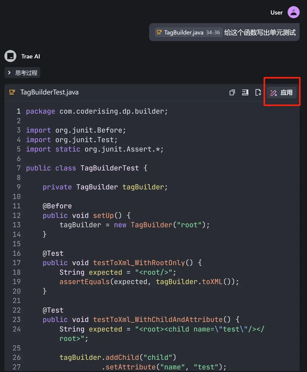 它迅速理解了代码,并生成了三个测试用例,我只需点击应用即可。