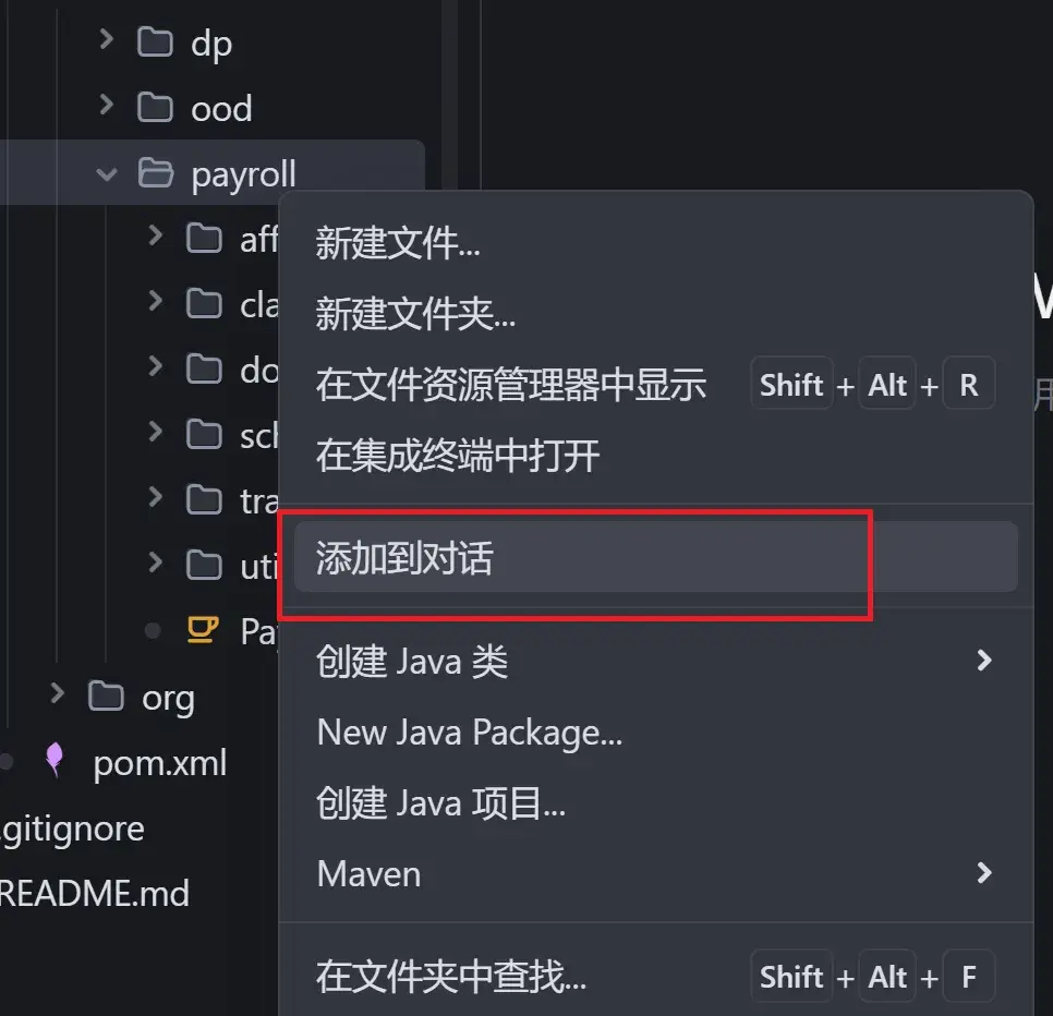 我将 WorkSpace 中名为“payroll”的目录添加到对话中,询问它该文件夹下的代码功能。