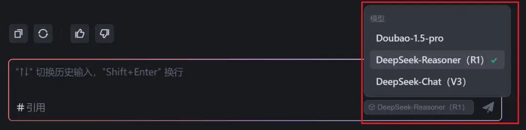 首先简单介绍一下 Chat 模式,该模式目前支持三种模型,我在使用时选择了 DeepSeek-Reasoner(R1)。
