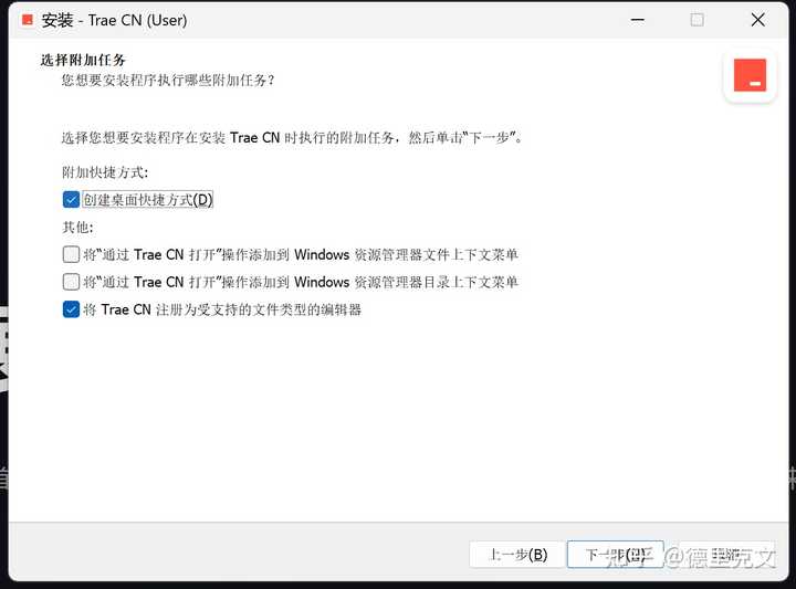 下载安装后,记得选择:“将 Trae CN 注册为受支持的文件类型的编辑器”。