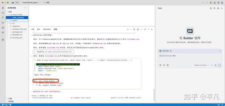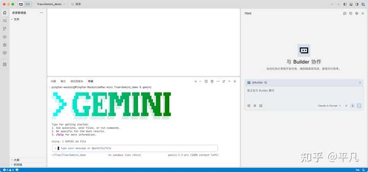 这些工具的使用方法大同小异,以 Trae 与 Google Gemini 为例,安装完成后的界面大致就是这样,你可以在右侧的 IDE 区域与 AI 互动进行自动化编程,同时也可以在下方红框内使用 AI 代理工具。