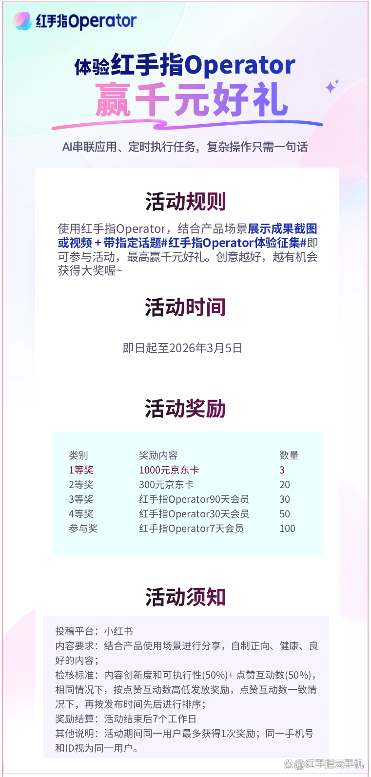 立即下载 , 加入红手指 Operator 的体验官行列,围绕指定话题 # 红手指 Operator 体验征集# 把你的体验截图或视频分享至小红书,活动时间至 2026 年 3 月 5 日,参与者有机会赢得千元大奖!