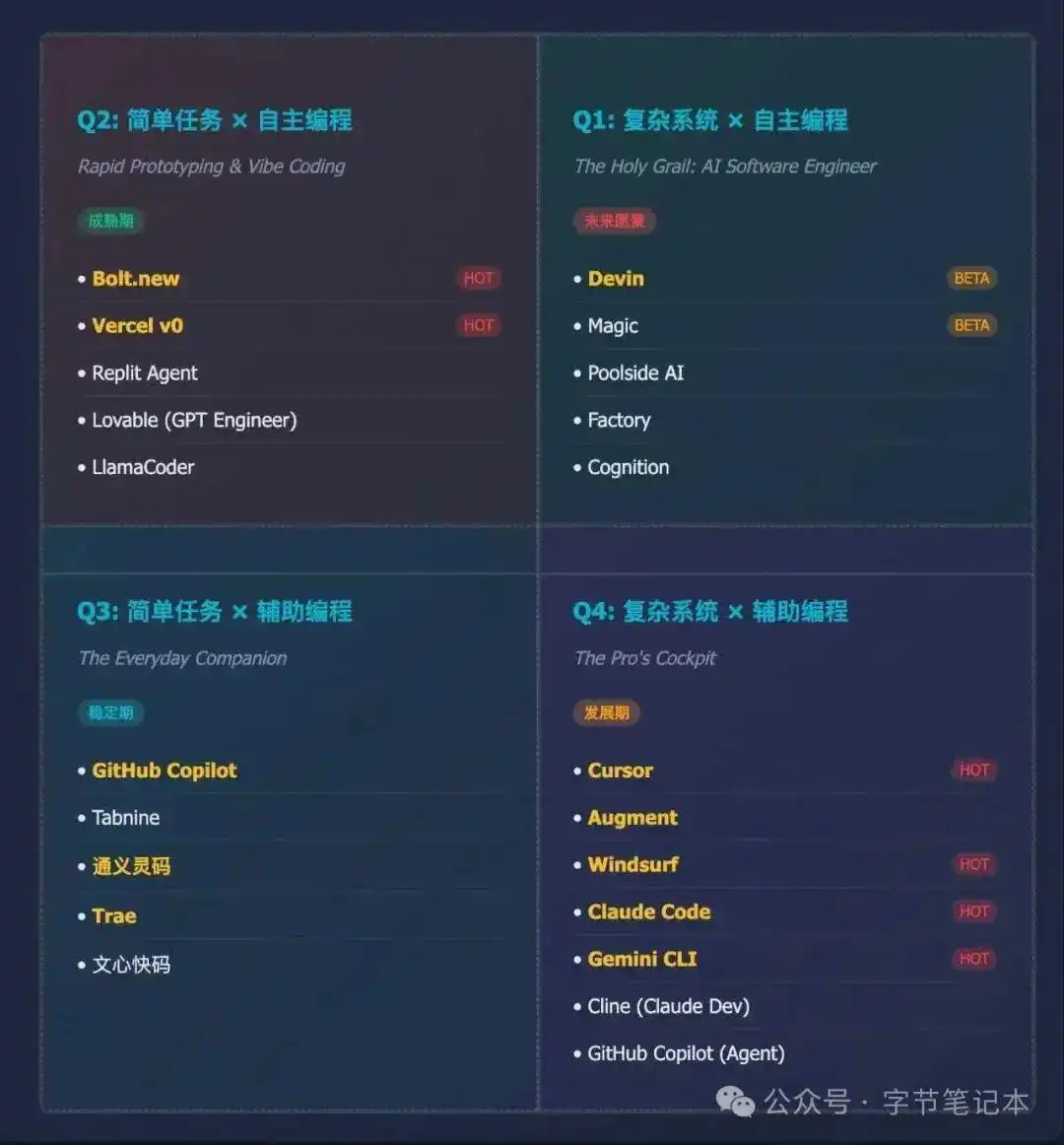 与以往单一的评测方式相比,我构建了一个二维四象限的坐标系,基于“任务复杂性”和“自动化水平”这两个维度,明确标识出目前最流行的 AI 编程工具。