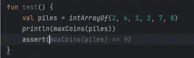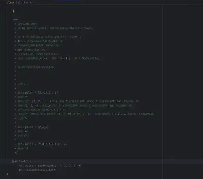 观察到,当我们将题目内容粘贴到函数注释后,AI 会自动生成测试用例。然而,这些用例的质量还有待提高,因为它们使用的是 println 来输出结果,这种方式需要开发者手动进行比对。理想的做法是使用 assert 函数来自动化对比,因此我们需要进行一些手动调整: