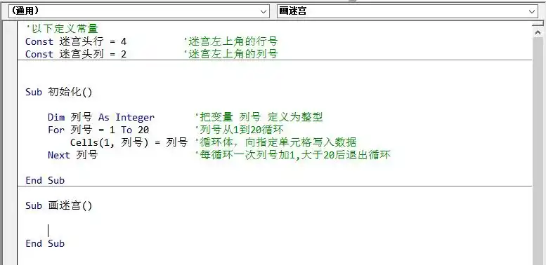 接下来,我们将开始编写第二个过程“画迷宫”,该过程位于第一个 Sub 初始化 () 过程的下方(如上图所示):