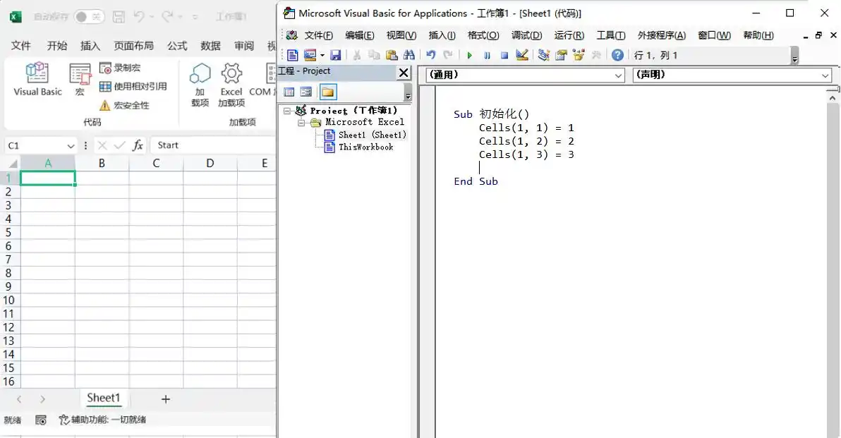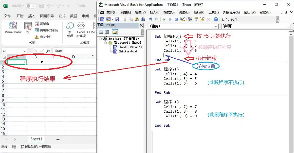 Sub 初始化() Cells(1,1)=1 Cells(1,2)=2 Cells(1,3)=3End Sub