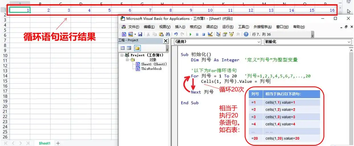 Dim 列号 As Integer '把变量 列号 定义为整型 For 列号 = 1 To 20' 列号从 1 到 20 循环 Cells(1, 列号) = 列号 '循环体,向指定单元格写入数据 Next 列号' 每循环一次,列号加 1, 大于 20 后退出循环
