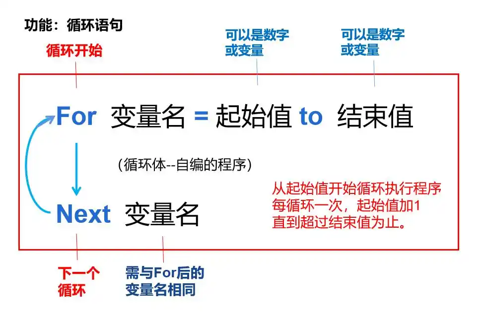 For 循环语句以 For 开头,以 Next 结束。中间为循环体,示例如下: