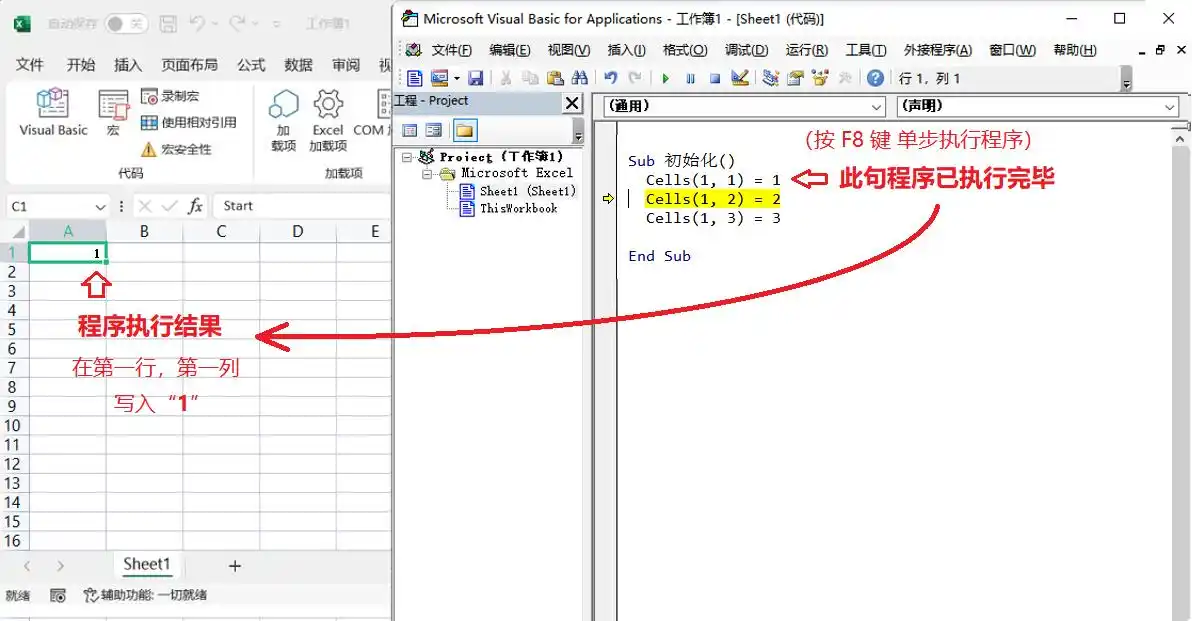 再次按 F8 键,黄色背景将移动到下一句 Cells(1,1)=1,表示此句将被执行。