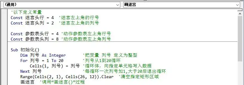 Sub 初始化() Dim 列号 As Integer '把变量 列号 定义为整型 For 列号 = 1 To 20' 列号从 1 到 20 循环 Cells(1, 列号) = 列号 '循环体,向指定单元格写入数据 Next 列号' 每循环一次列号加 1, 大于 20 后退出循环 Range(Cells(2, 1), Cells(26, 12)).Clear '清空指定矩形区域 画迷宫' 调用“画迷宫()”过程 画动作参数表 ' 调用“画动作参数表()”过程 End Sub