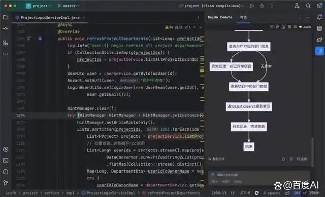作为一名 AI 架构师,文心快码能够深入分析业务场景,帮助开发者解决架构方面的挑战。文心快码具备增强私域知识的能力,利用 RAG 技术提供数据检索的增强功能,从而提升模型生成的能力与准确性。对于一些代码架构的疑问,开发者通过文心快码的代码解释,能够迅速掌握函数在实际业务背景下的含义,并通过流程图直观理解完整的调用逻辑,激发更多的开发创意,有效解决实际研发问题。