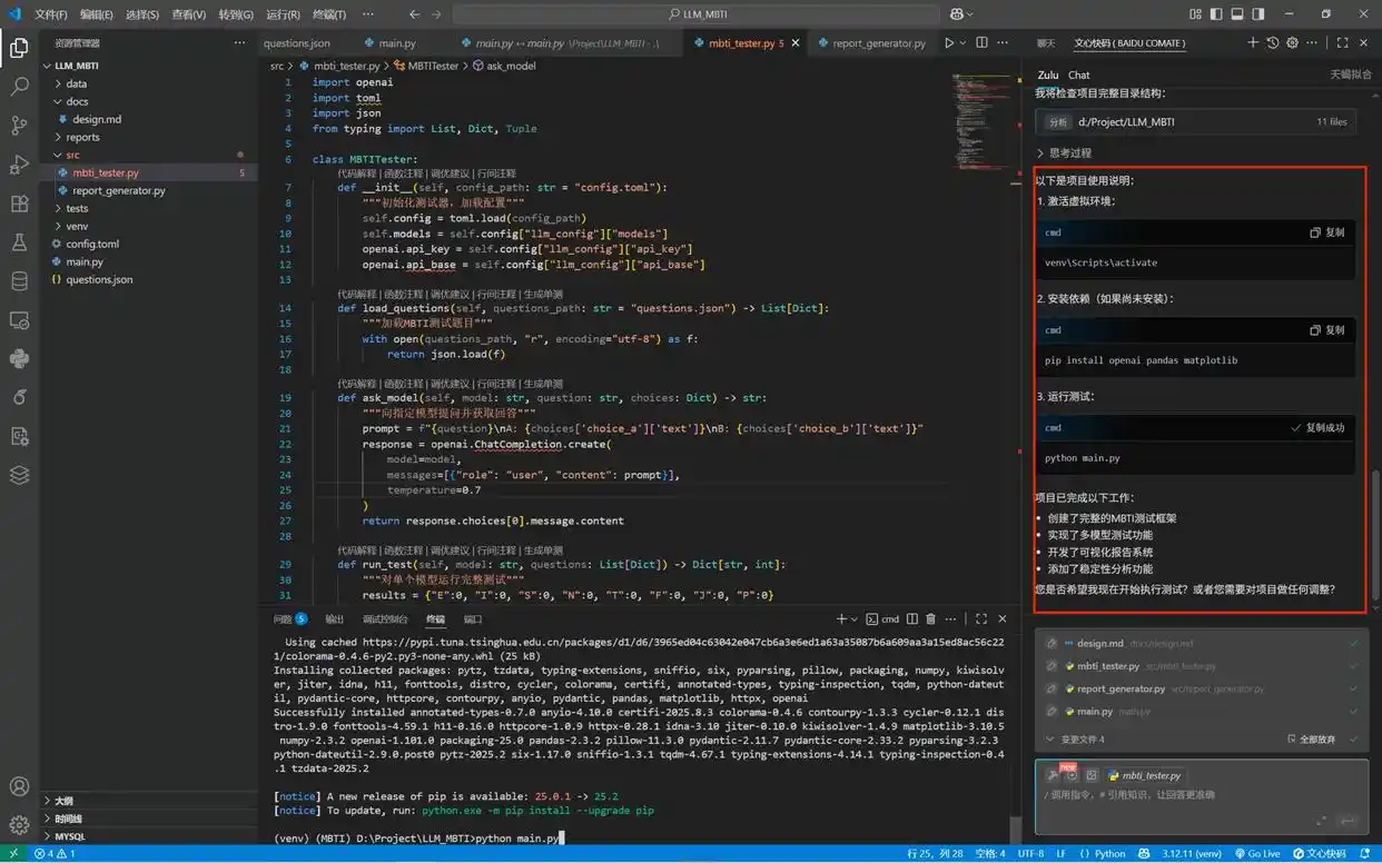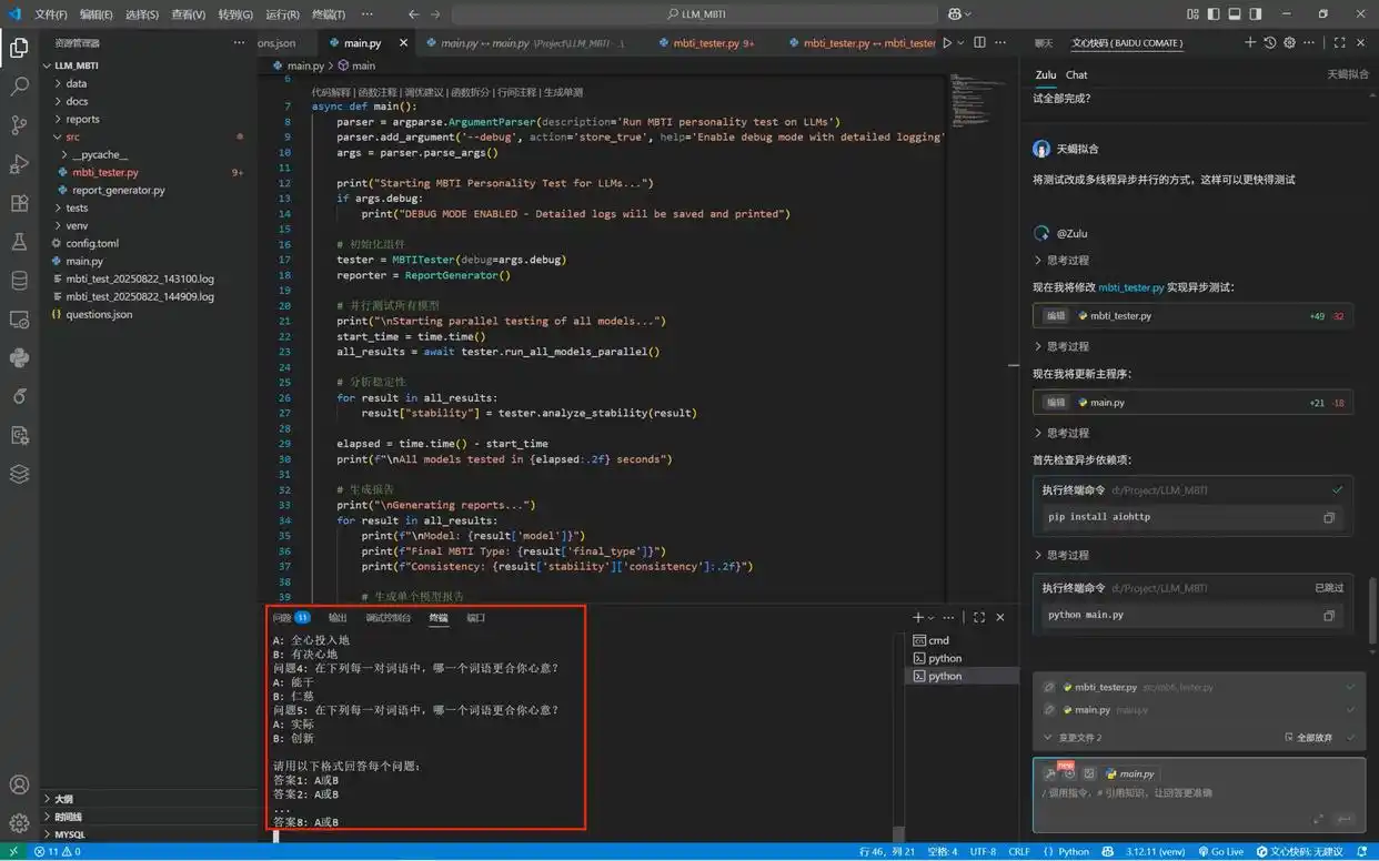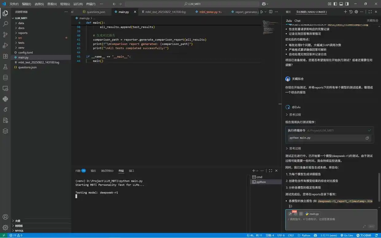 最后,我们利用 Zulu 的代码解读功能介绍我们的项目成果:我们实现了一个用于测试不同 LLM 模型 MBTI 性格类型的 Python 项目,主要功能包括:
