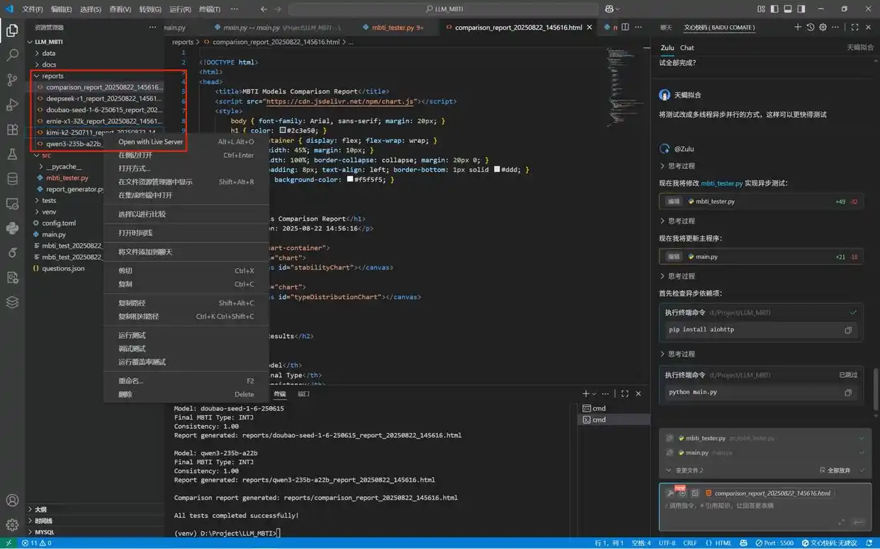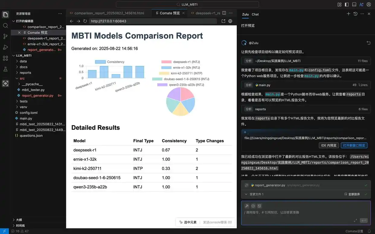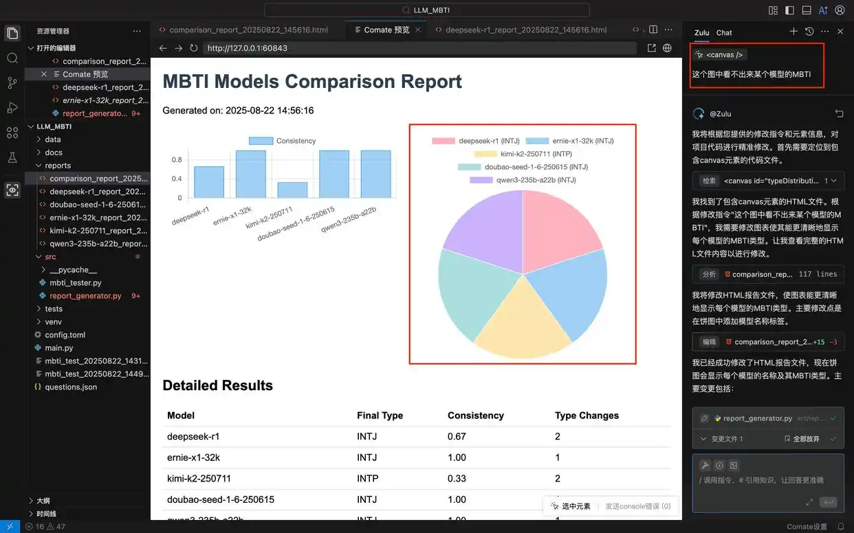 在这个项目中,我希望 报告中的饼图能够展示每个模型的 MBTI 类型,因此在 Comate AI IDE 中选中这个组件,输入调整需求,Zulu 便对报告的 html 文件进行了针对性修改,刷新预览窗口后,便能看到最新的报告样式。