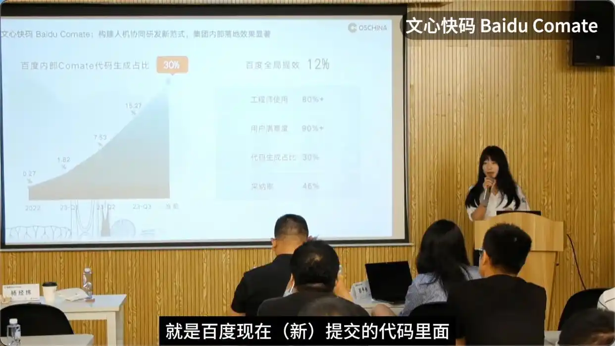 对于文心快码 Baidu Comate 的效果,我们可以首先关注集团内部的应用情况。我们始终致力于构建人机协同的研发新模式,而这一理念在集团内部得到了显著落实。从 2022 年起,我们开始推进这一能力,当时的代码生成比例仅为 0.27%。到 2023 年第二季度,比例提升至 7.53%,目前集团的整体代码生成占比已经达到 30%。这意味着什么呢?也就是说,百度目前提交的代码中,近三分之一是由 AI 生成的。这一变化为我们带来了约 12% 的整体效率提升,且工程师的使用覆盖率达到了 80%,几乎所有研发工程师都在使用文心快码 Baidu Comate。同时,用户满意度超过了 90%,而采纳率则在 46% 左右。
