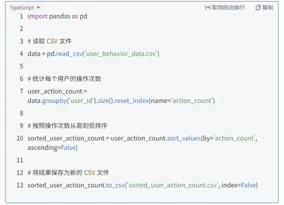 百度的“文心快码”在代码生成领域引起了不小的轰动!这款工具拥有许多亮点,依靠百度强大的技术实力和丰富的数据资源,能够快速而精准地生成代码。举个例子,如果你想用 Python 处理数据分析任务,只需简单描述需求,例如“从包含用户行为数据的 CSV 文件中,计算每个用户的操作次数,并按次数降序排列,最后将结果保存为新的 CSV 文件”,文心快码便能够迅速理解你的意图,并生成一个合适的代码框架。