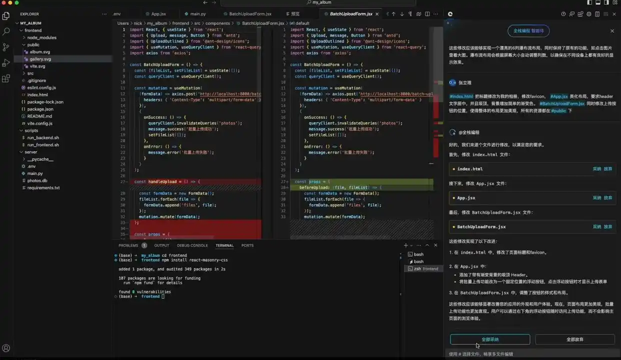 如果生成的代码符合预期,可以逐个文件点击「采纳」,或者选择「全部采纳」,将更改批量应用于当前项目。