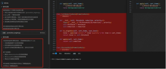 例如,上周我负责开发一个电商促销系统的模块。在参加会议前,我匆忙在文心快码 Zulu 和其他几个 AI 编程工具中输入了“我们需要一个能自动计算满减、折扣、会员价叠加的促销引擎,并希望能兼容去年活动的规则”,这一需求并没有经过深入思考。客观来看,这并不是一个十分清晰的需求描述,因为通常情况下,满减门槛是有阶梯式的,折扣也可能存在品类限制,会员价则分为不同等级,而这些都没有在我的需求中提及,显得十分模糊。因此,在离开座位后,我并没有对此事过于担心,心想即便这些 AI 编程工具生成了代码,也未必能满足我的要求。会议结束后回到工位,我逐一打开之前的 AI 编程工具,果不其然,生成的代码大多围绕基本框架展开,例如简单的“满 200 减 50”这样的规则设计,完全没有考虑去年的活动中复杂的“跨店满减”或“会员专享折上折”等玩法。有的代码甚至连会员等级与折扣系数之间的映射关系都没有处理好,更别提不同优惠之间的互斥规则了。对于我来说,这些代码虽然在形式上正确,却毫无实际用处,根本无法捕捉到我潜在的需求。相反,当我打开文心快码 Zulu 时,看到它严谨的思考过程、清晰的逻辑链条和完整的代码框架,顿时有种遇到知音的感觉。众多我测试的 AI 编程工具中,唯有文心快码 Zulu 能够透过我模糊的语言识别出“满减、折扣、会员价叠加”可能涉及的复杂优惠优先级计算,并标记出需要确认的三个关键细节:满减是否分阶梯、折扣是否存在品类限制、会员价与其他优惠之间的互斥规则。