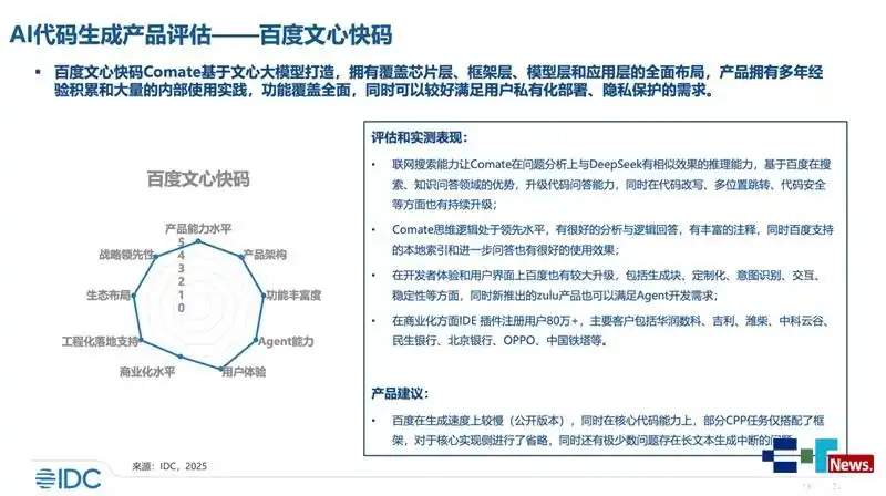2023 年 6 月 3 日,国际数据公司(IDC)正式发布了《IDC 中国市场代码生成产品评估,1H25》报告。该报告对市场上主要的 AI 编码工具进行了全面评估,参与评测的企业包括谷歌、微软、百度、阿里、字节跳动、腾讯等多家知名公司。在报告中,涉及到的九个评分维度中,百度的智能代码助手——文心快码(Baidu Comate)在八个维度上获得了满分,成为满分数量最多的产品。