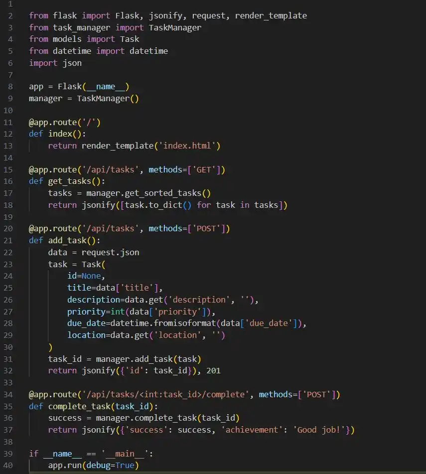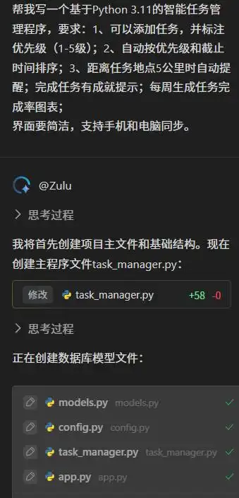 为了让文心快码(Baidu Comate)明白我的期望,我需要用“人话”来描述我想要的功能。具体来说,我希望它能帮助我编写一个基于 Python 3.11 的智能任务管理程序,要求如下:1、可以创建任务并标记优先级(1 到 5 级);2、能根据优先级和截止时间自动排序;3、在距离任务地点 5 公里时进行提醒;4、完成任务时有成就提示;5、每周生成任务完成率的图表。界面应简洁,并能在手机与电脑间同步。