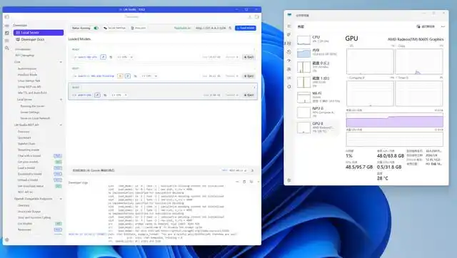 AMD 锐龙 AI Max+ 395 平台以其对 128GB 内存的全面支持和高达 96GB 的显存分配能力,为大模型的部署提供了充足的硬件资源。在 64GB 显存的配置下,我们成功尝试了同时运行三个大型模型:包含两个 30B MoE 模型和一个 14B 稠密模型。结果显示,系统仅消耗了约 50GB 显存,剩余的硬件资源仍显得相当充裕。