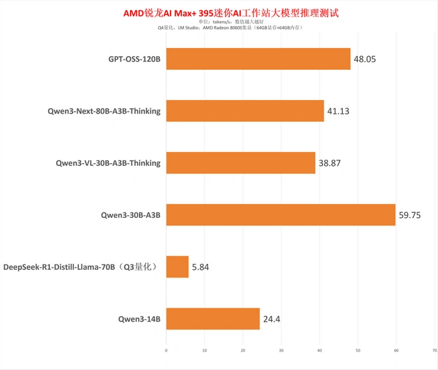 值得一提的是,AMD 锐龙 AI Max+ 395 迷你 AI 工作站非常适合用于本地大型模型的部署。根据以往测试结果,该平台能够流畅运行 70B 稠密大型模型(推理速度达到 5.84 tokens/s),而对于 120B 的 MoE 大模型,其推理速度更是高达 48.05 tokens/s,应对 80B、30B 等主流 MoE 模型几乎毫无压力。