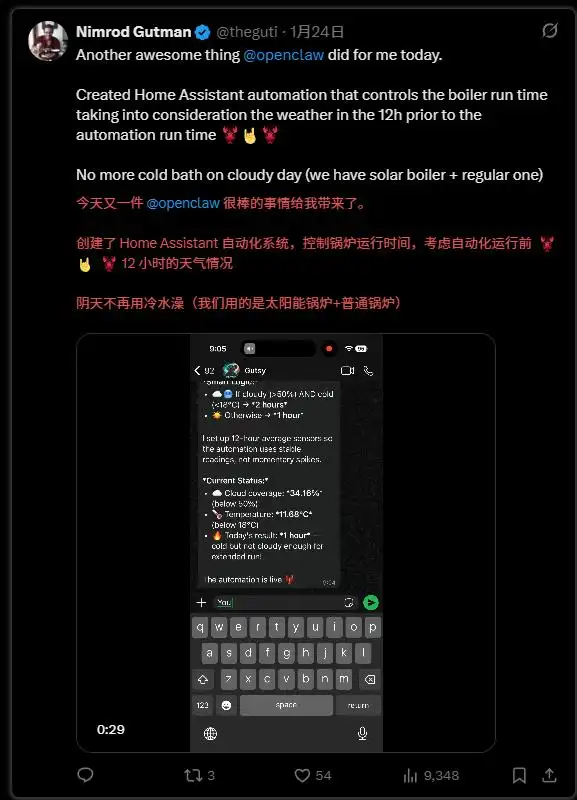 有用户将 OpenClaw 与实际生活场景相结合,直接让其控制烧水的锅炉,根据天气情况定时加热水,以免冬天没有热水可用。更有甚者,许多人借助 OpenClaw 进行股票交易、撰写自媒体文章和社区管理等工作。一些公司也尝试将 OpenClaw 作为内部“公司助手”,连接各类 SaaS 和数据系统来实现自动化。