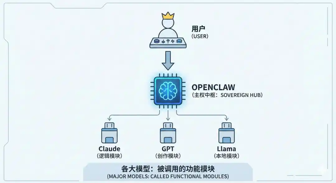 这张 AI 生成的图示展示了:用户将成为真正的掌控者,OpenClaw 将成为其权杖,而其他 AI 将受其指挥。这一设想看似合理,实际上是对过去几十年分工模式的反叛,用户首次获得了真正的主权。(当然,我们期待它能够顺利实现,仍有很长的路要走。)