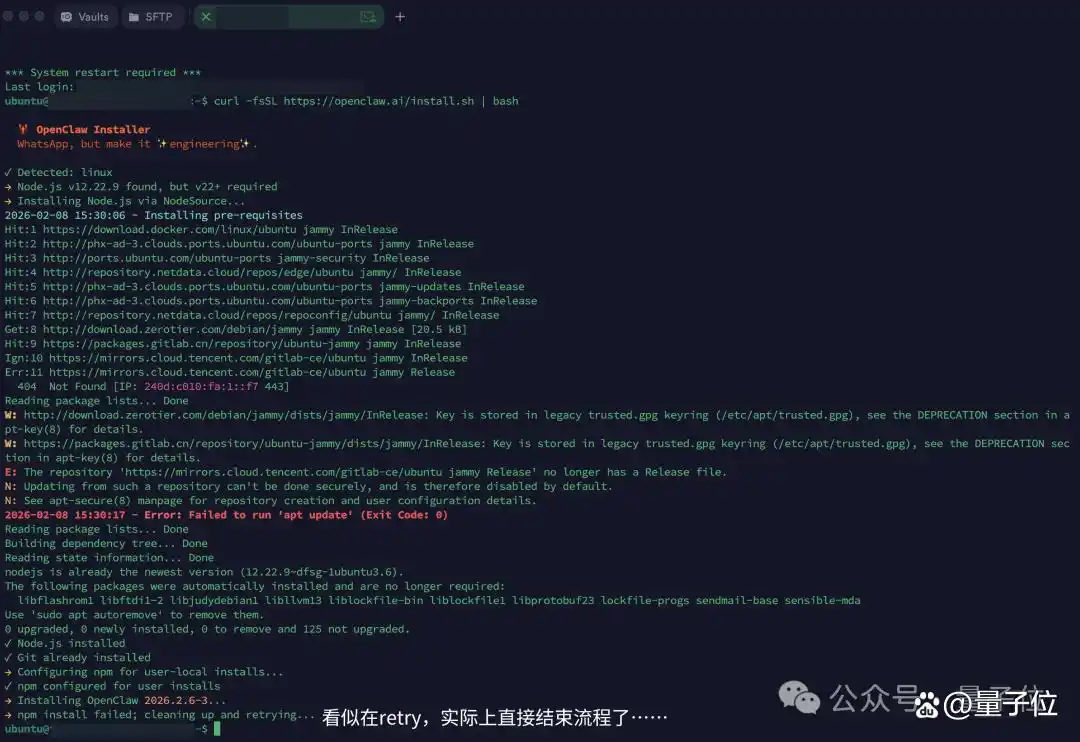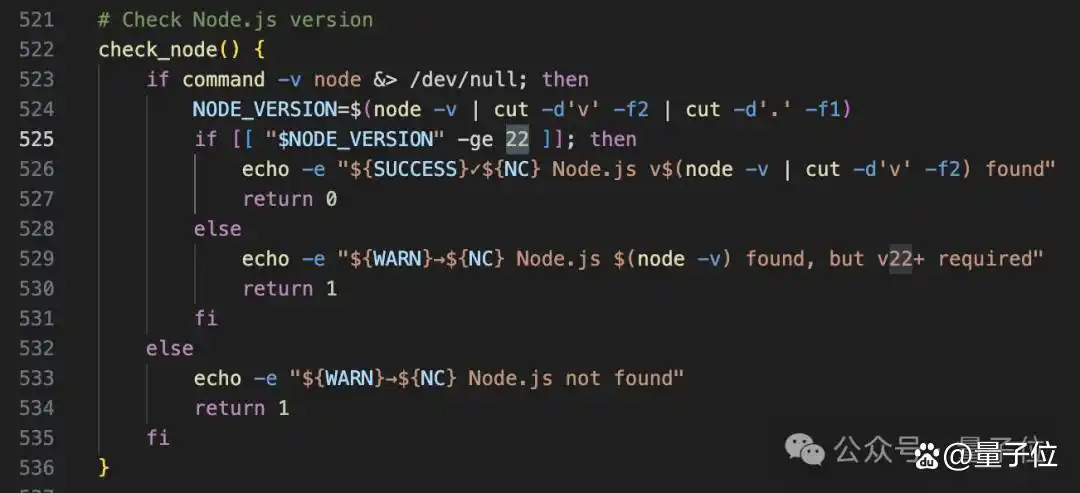 我还特意查看了这行命令背后的 install.sh 源码,发现其中隐藏了不少“环境杀手”。首先是版本校验,脚本中清晰表明需要Node.js 22+,但是目前许多云服务提供商的 Ubuntu 或 CentOS 默认镜像,Node 版本常常停留在 v18 甚至更低,导致脚本执行至一半时就会报错,迫使你手动升级系统环境。
