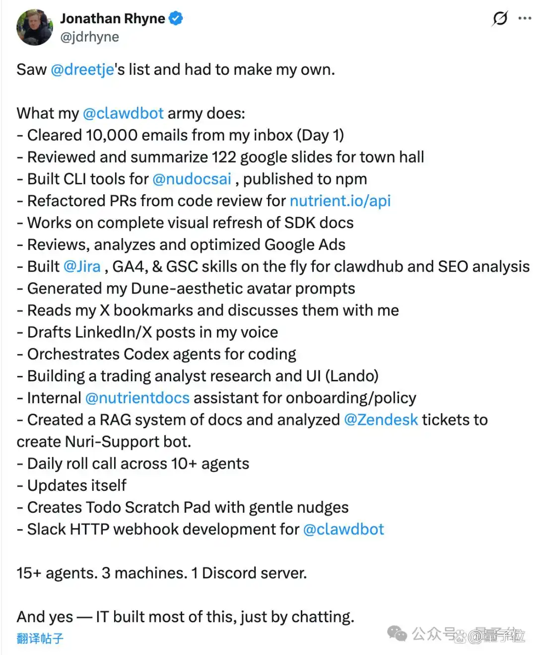 如此热度的背后,是因为它早已超越了普通聊天机器人的范畴,被广泛认可为真正能指挥电脑执行工作的“数字员工”。例如,有位网友利用三台计算机和 15 个 Agent,成功组建了自己的“数字军团”。他只需在一个 Discord 频道中进行指挥,便能让这些 Agent 执行处理邮件、阅读 PPT、编写代码、发布推文,甚至撰写每日报告等多项任务。