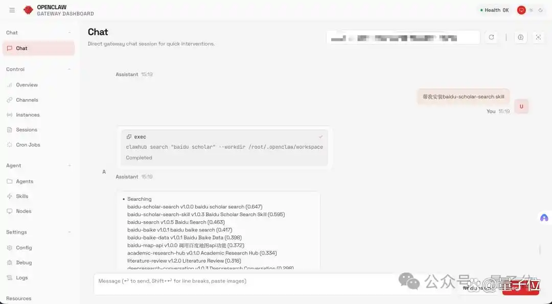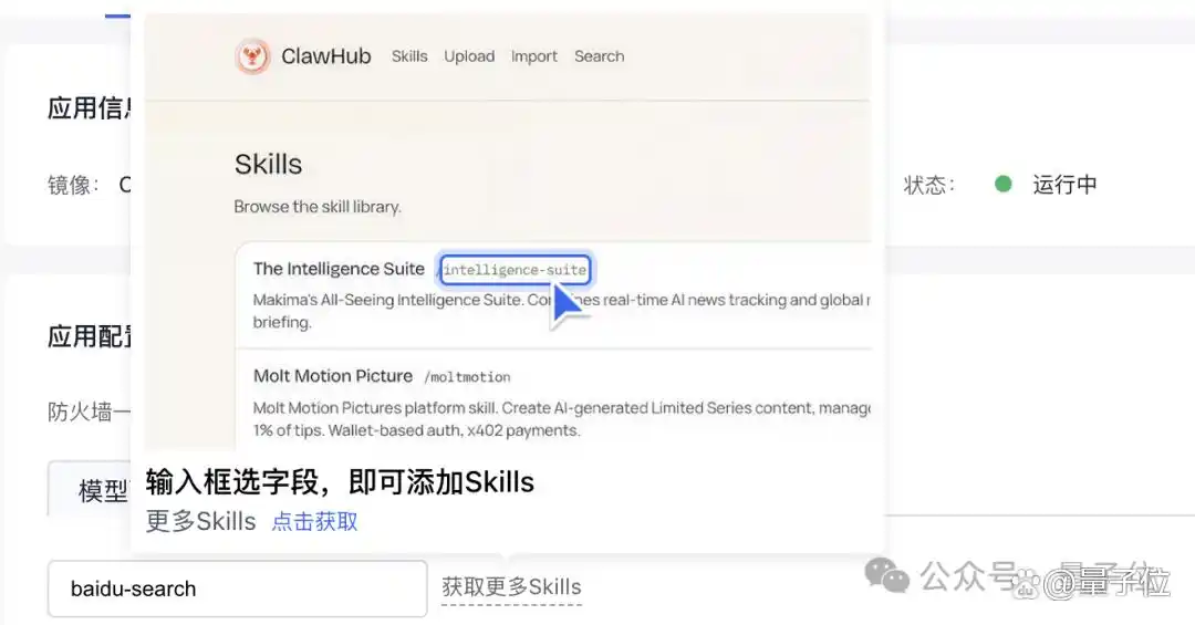 到此为止,我们的这栋房子至少达到了简约的“拎包入住”水平,但并非所有人都满足于此,可能还想增添更多功能,即 OpenClaw 的 Skills。 这一过程也非常简单,您只需了解 Skills 在 ClawHub 上的 ID,然后填写进去,点击应用即可完成。