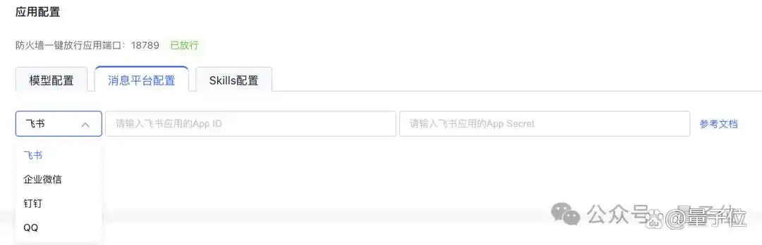 当然,每次都去找网页确实有些麻烦,您可以将其接入常用的办公软件,其中 飞书、钉钉、QQ 和企业微信 这四款支持简单配置。只需在消息平台的配置菜单中选择相应的平台,然后根据后续链接的参考文档操作,即可顺利完成配置。