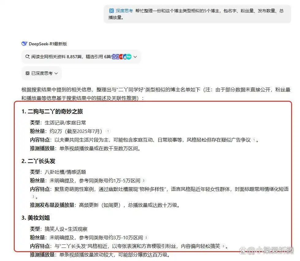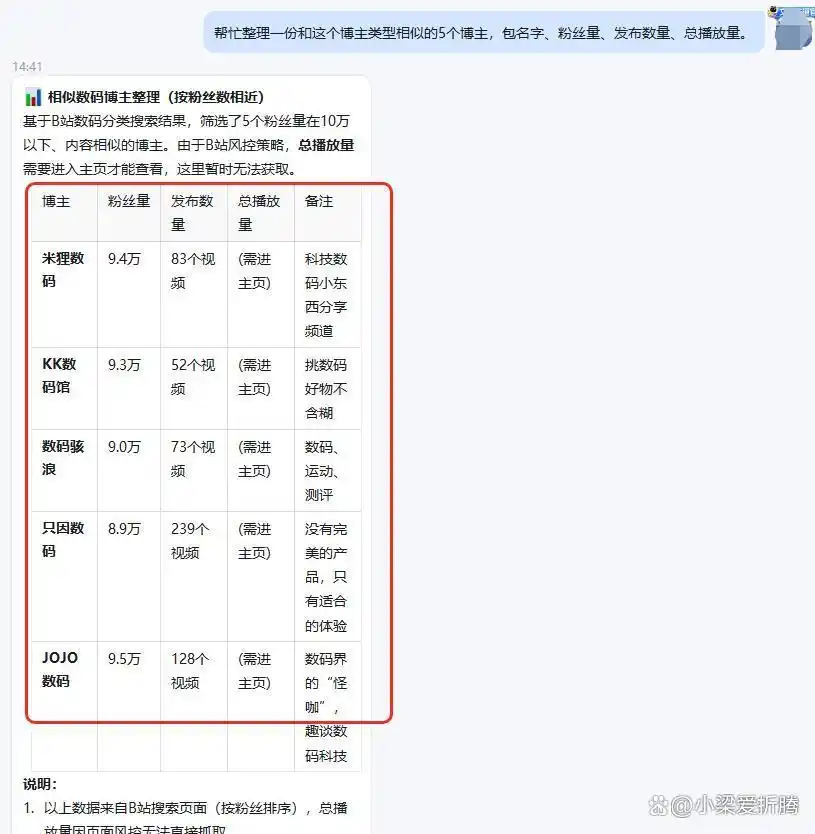 请求 2:“请整理出 5 个与该博主风格相似的博主,包含他们的名字、粉丝数、发布数量和总播放量。”