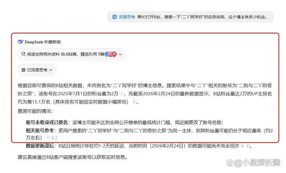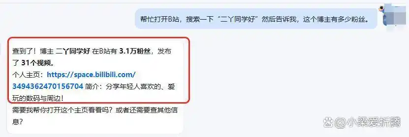 请求 1:“请帮我打开 B 站,搜索‘二丫同学好’,并告知我该博主的粉丝数量。”