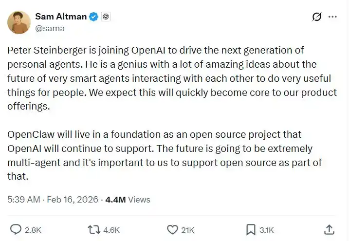 “Peter Steinberger 的加盟将推动下一代个人智能体的开发。” Altman 指出,“我们预计这将迅速成为我们产品的重要组成部分。”