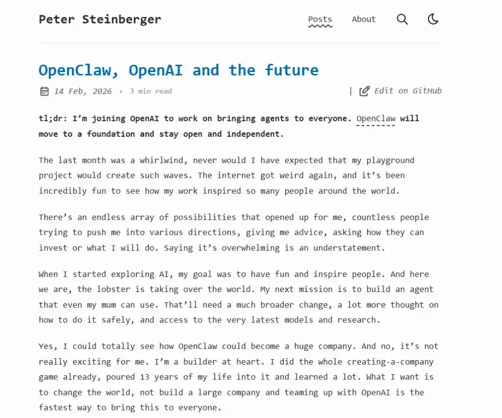 Steinberger 坦言:“我认为 OpenAI 是实现我的愿景并扩大其影响力的最佳平台。”
