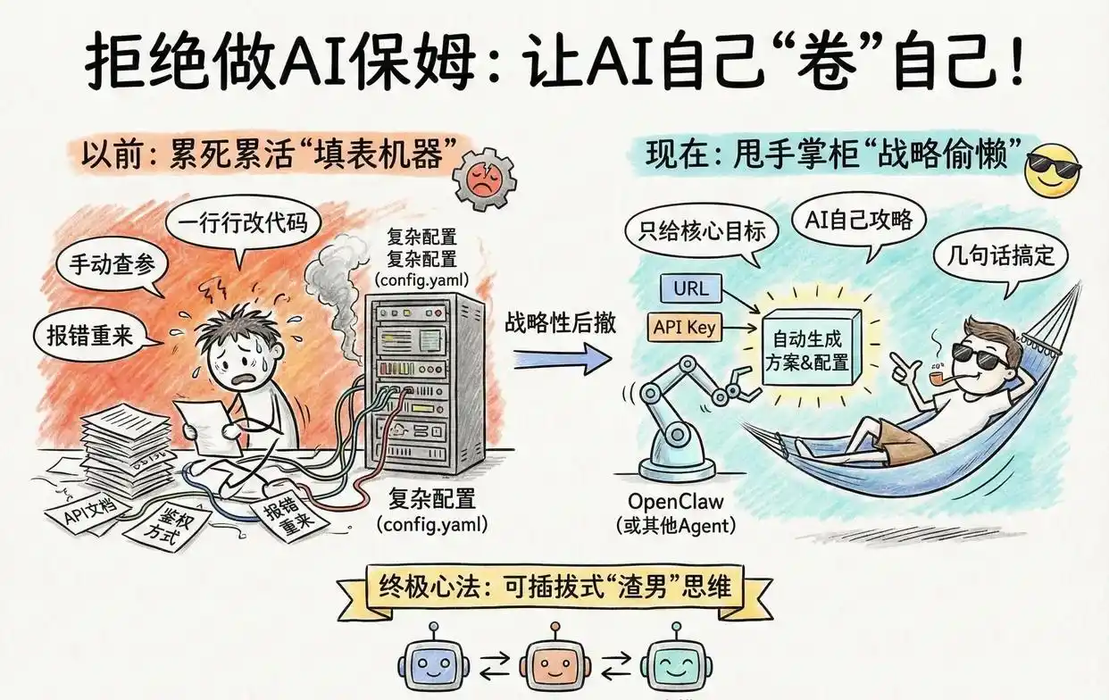 然而,我发现许多人仍在门外观望,或者一开始就掉入了死胡同。很多人虽然掌握了 OpenClaw,却仍然以传统的思维方式去操作。每天纠结于它是否能够自动绕过人机验证,API 接口的具体使用方式,以及那数百行的 config.yaml 文件是否需要逐行修改。老实说,这种操作就像拥有了一台智能扫地机,却依然在旁边盯着它清扫房间,既疲惫又痛苦。