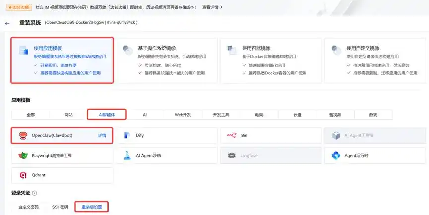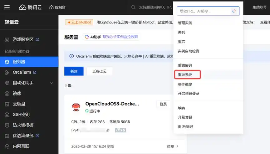 如果您已经有闲置的服务器,也可以直接 重装系统,选择 OpenClaw 模板完成操作。