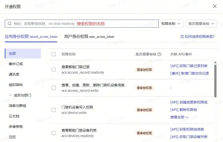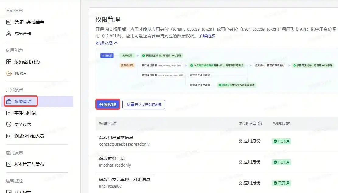 需要开通的权限如下,这些权限都是免审权限,可以直接开启,无需等待审核。