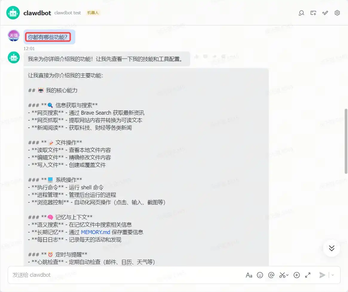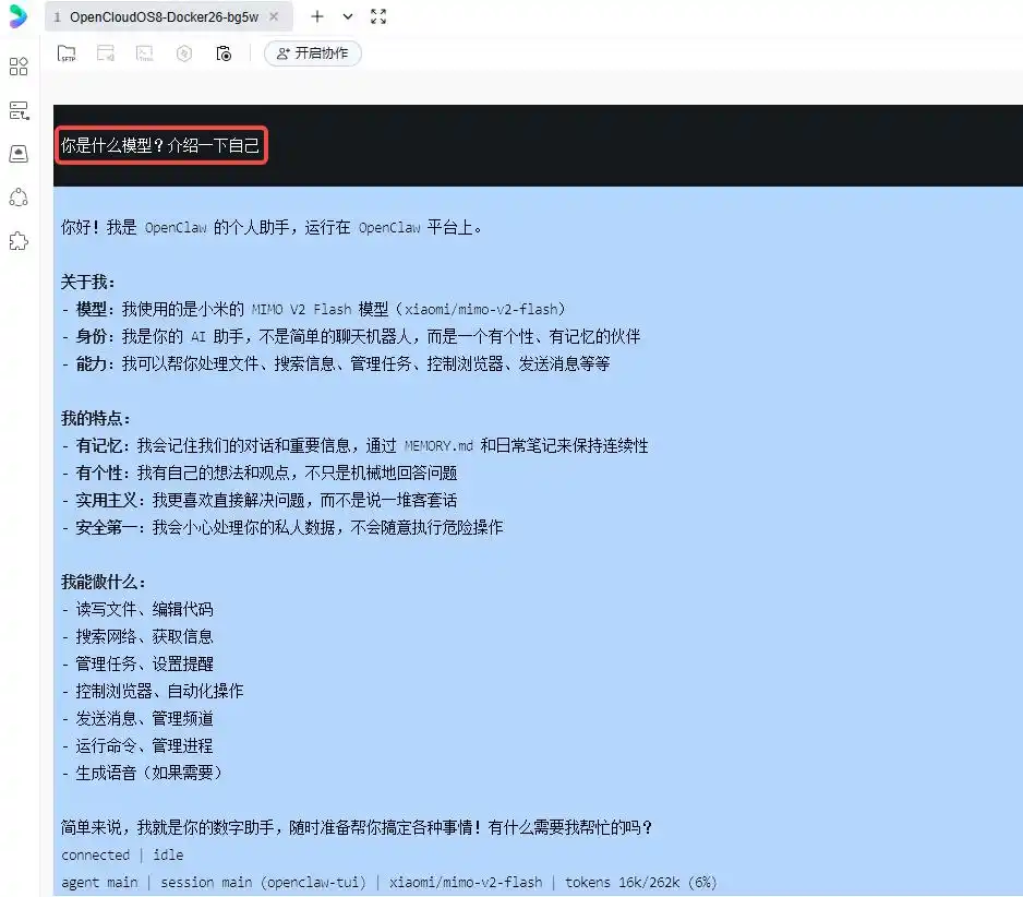 尝试与 OpenClaw 进行对话,如果能够正常响应,表示配置已经完成成功!