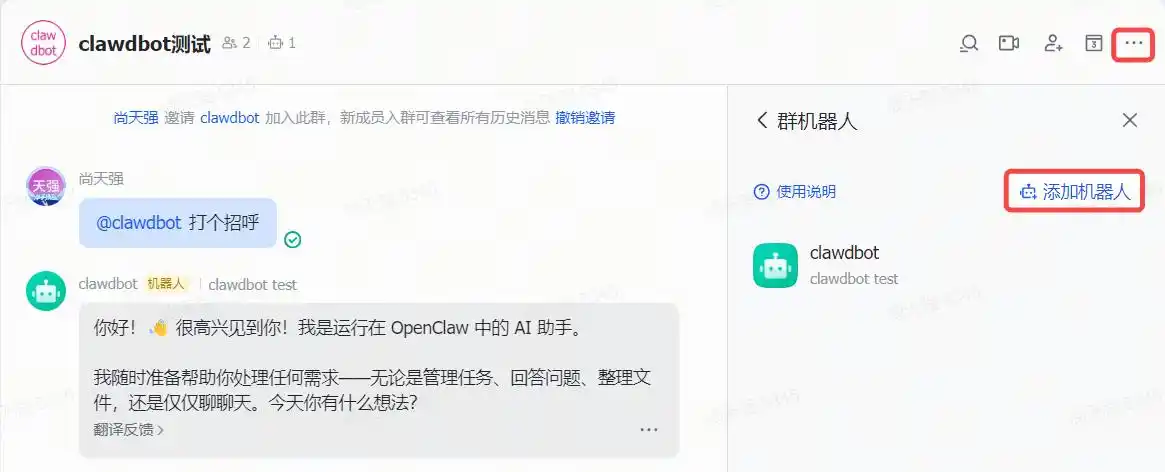 若希望将机器人加入到群聊中,只需新建一个群聊,点击 设置 → 添加群机器人 即可。